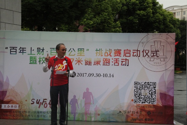 活动发起人校友代表杨玉成在起跑前发表了热情洋溢的讲话。他以习总书记“没有全民健康,就没有全面小康”的理念为引导,结合自己爱上马拉松、并成为业余一级马拉松运动员的亲身经历,诠释了健康的意义和价值。他表示健康是人生的基础,是一切成功的基石;而长跑,是一项既能锻炼身体、又能磨练意志的运动项目。唯有锻炼好身体,才有可能、有机会为上财,乃至为国家贡献自己的力量。他希望通过大家的共同努力,聚合各界力量共同跑出百万公里,以一种“在路上”的心态不断奔跑,以一种执着的追求去实现梦想,为上海财经大学百年华诞送上祝福。希望今天我们在路上,明天、后天、未来的很多日子,还会有更多的人在路上,积极地对待生活,挑战自我、超越极限、坚韧不拨、永不放弃,在人生的路上看得更高,走得更远。