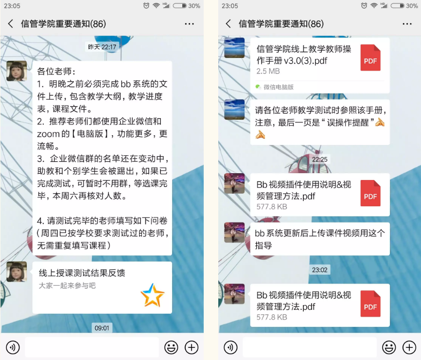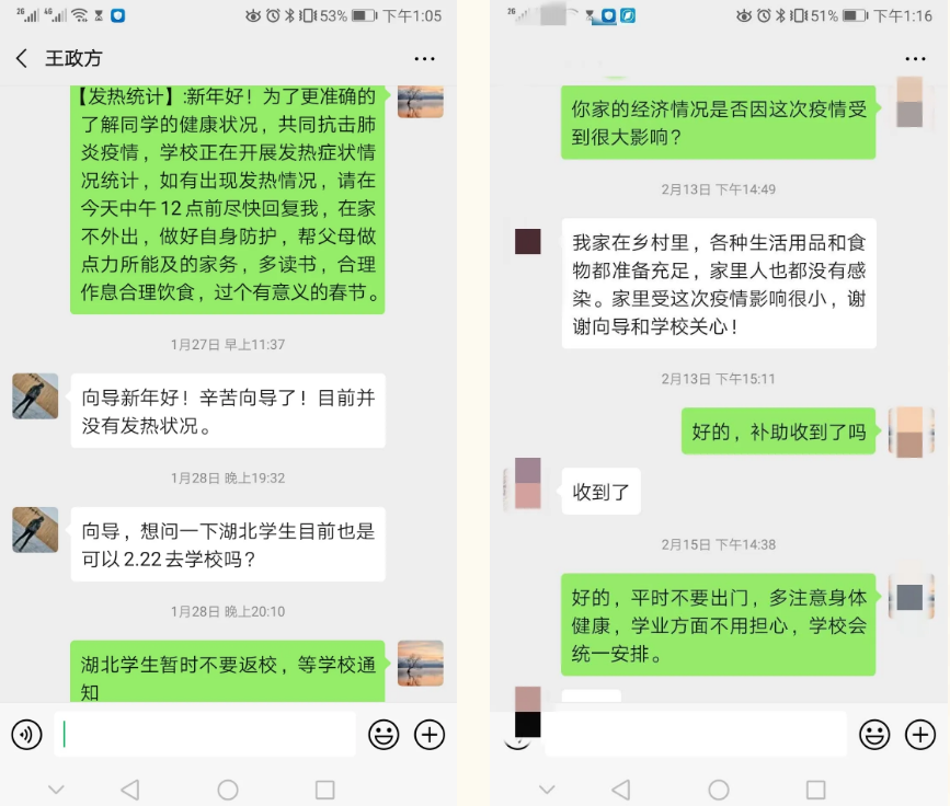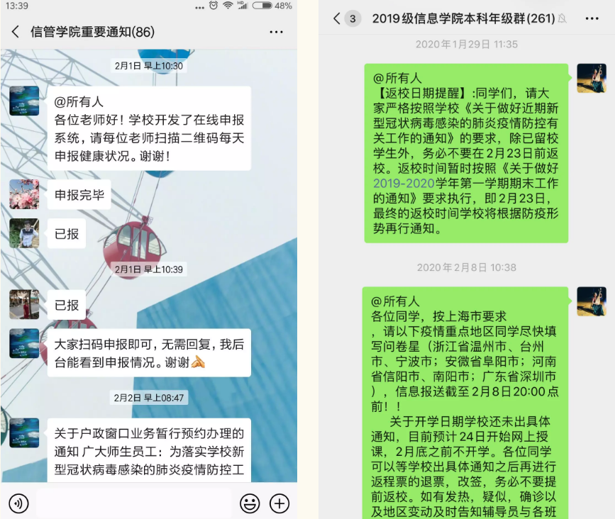 通过微信群、线上会议等渠道向每一位师生及时传达上级组织关于疫情防控的重要精神,明确要求学生“在线学习、暂缓返校”,教职工“按时复工、按需返校”;关注师生身心健康,倡导师生在家科学防疫,不信谣、不传谣;精准到人,精确到事,全面而持续排摸全院师生情况并及时上报,扎实将“严防扩散、严防爆发,确保一方净土、确保生命安全”落到实处。