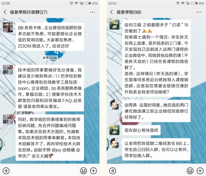 召开多次线上会议,讨论决定形成线上教学领导小组,分为教学组、技术组和学生组,分工明确,各司其职,压实学院教学工作;分时间段开展线上教学测试,发放问卷调研实际操作中存在的问题,在整合已有的技术指导的基础上,形成具备完整流程的线上教学指导手册,为师生提供技术支持;安排技术人员定期值班,为师生实时提供技术问题解答,及时汇总和反馈暂未解决的问题;在教师开展线上教学之外,导师开展远程指导,学生灵活自主学习,充分利用线上教学优势,实现“延期不返校,延期不停教,延期不停学,延期不停研”。