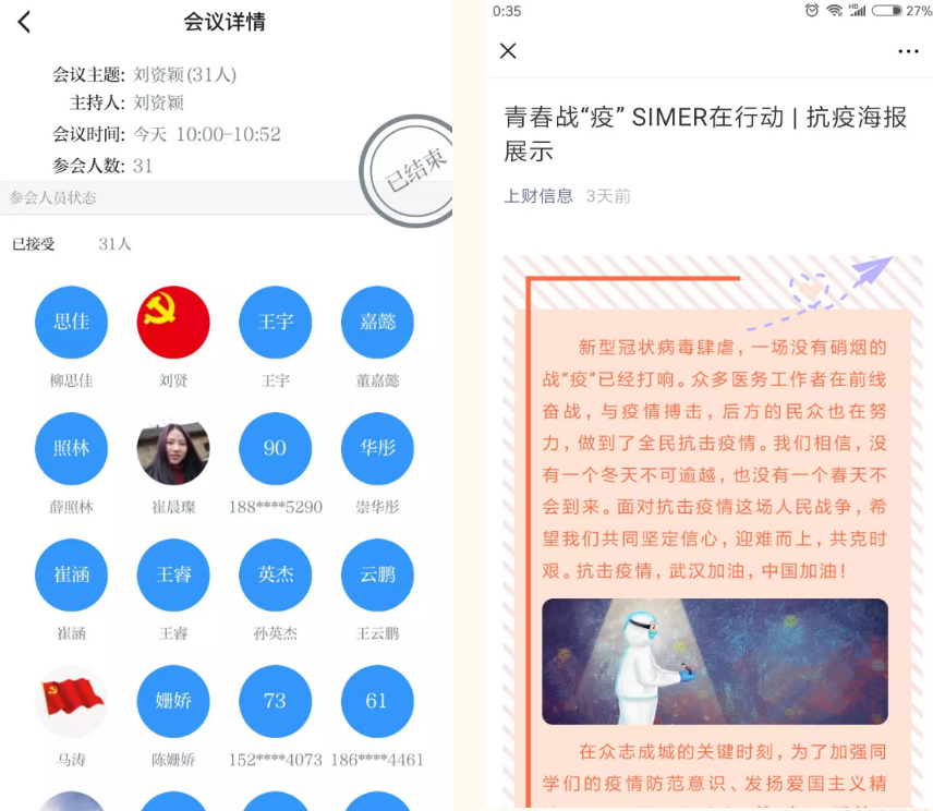 召开本科生党支部抗击疫情专题组织生活会,传达党中央及各级政府关于疫情防控的重要精神和决策部署;院团委积极响应共青团中央关于《返乡大学生团员们,请到社区(村)报到!》的号召,有序动员团员青年在确保自身身体健康的前提下主动向社区(村)报到,听从社区党团组织安排,依法科学有序参与社区疫情防控,用实际行动诠释当代青年的责任与担当;积极引导和指导学生组织创新活动形式,依托“上财信息”微信平台,充分发挥新媒体平台功能,线上线下相结合,实现了第二课堂活动不停步,帮助了同学们安心居家、积极战“疫”。