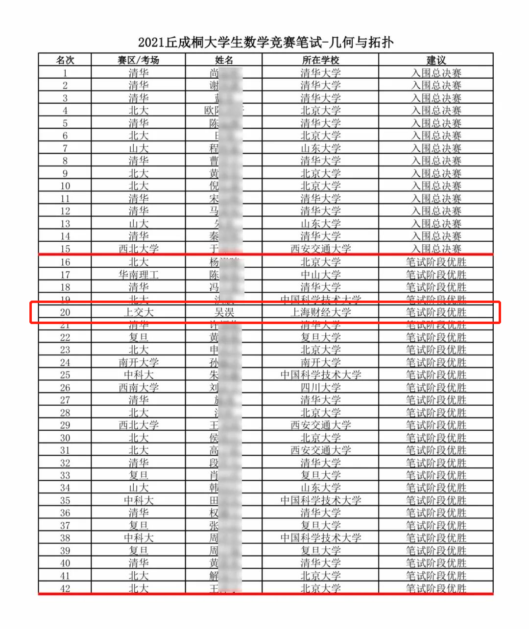 (吴淏同学在第十二届丘成桐大学生数学竞赛中获得优胜奖)