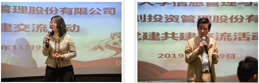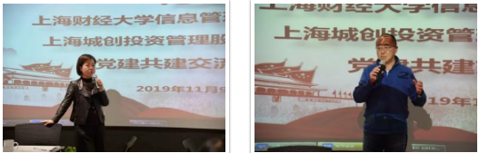 接着双方就党建活动进行了交流。学院党委书记王淑范同志介绍了学院教工党员概况和教师党员在学院事业发展中发挥的模范带头作用。她指出学院党建工作的重点是凝聚共识、助力发展。党建工作要与专业发展融合、与社会服务融合、与人才培养融合,这是学院党建工作的着力点,希望通过共建推动专业合作、团队建设、就业指导、实习实训等方面的深度交流与合作。城创公司党支部书记江庆春表示,企业党建工作的重点是围绕经济发展进行的,希望今后加强与学院教工党支部的联建共建,共同深入做一些金融科技方面的探讨,通过产学研一体化的合作能够培养出更多优秀的硬核人才。