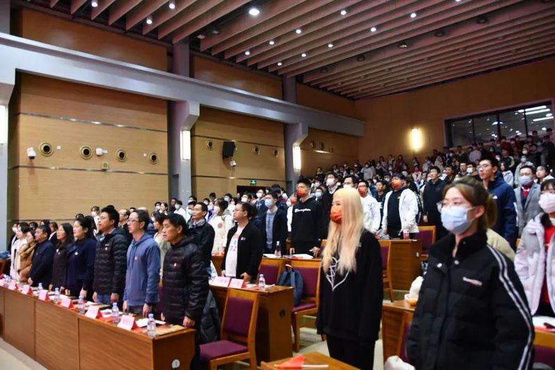 活动第一个环节——开幕式。奏唱国歌,全体起立向国旗行注目礼。