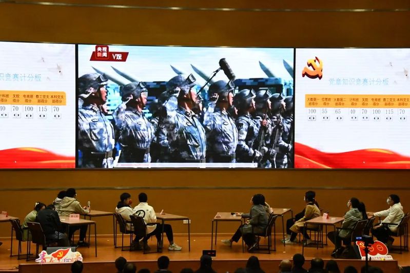 第三个环节——党章知识趣答。共分为单选题、填空题、趣味题、多选题及风险题五轮答题环节。考察的题目既有党章基本知识,又有时事热点问题;既有老一辈党的领导人的重要指导思想,又有党的新一代领导集体的智慧结晶;既有党的重要历史事件知识,又有党的基本规章制度。考察知识面广,趣味性强,思想性高,让到场师生品味到了一场党史党章知识大餐。八支队伍展开了激烈竞争、比分你追我赶,选手们凭借自己铭记在心的党章、党史知识,为自己的队伍争夺每一分,不少难度很大的题目也被选手们一一拿下,赢得了观众们的热烈掌声。