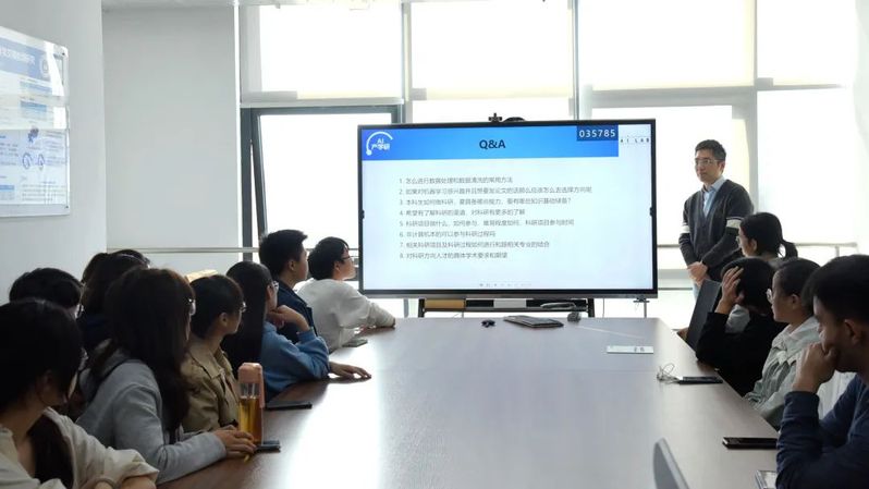 同学们针对当前实验室的主要工作和参与项目都表现出了浓厚的兴趣,在其后的Q&A环节和黄老师进行了热烈且细致的讨论,同学们的问题主要集中在“科研做什么、怎么做”以及“做科研需要具备什么样的能力”这两个方面,黄老师认为需要培养批判性创造性的思维方式和能够解决问题的动手能力;韩潇老师也补充了她的看法:她认为很多科研问题往往是从实际需求中挖掘出来的,而我们实验室丰富的项目实践经验和机会能有效地帮助同学们发掘研究问题,她鼓励有兴趣的本科同学可以从简单的任务做起,逐步参与到项目和科研活动中来。