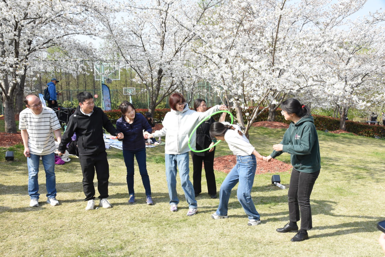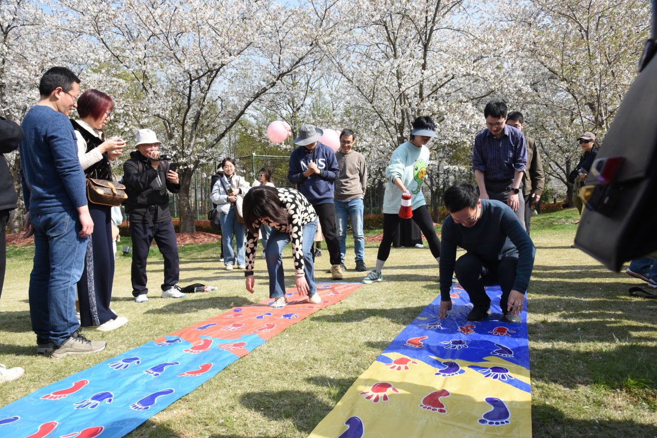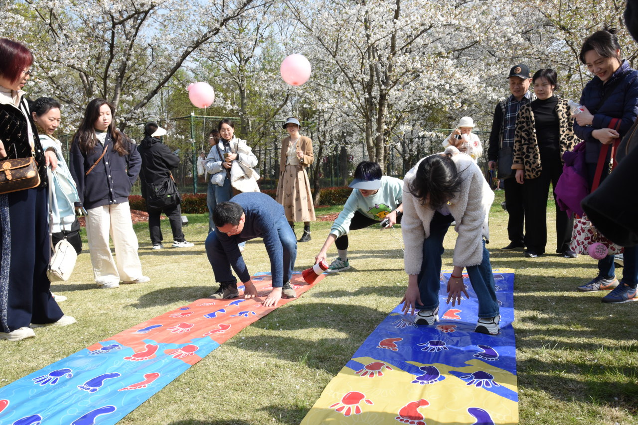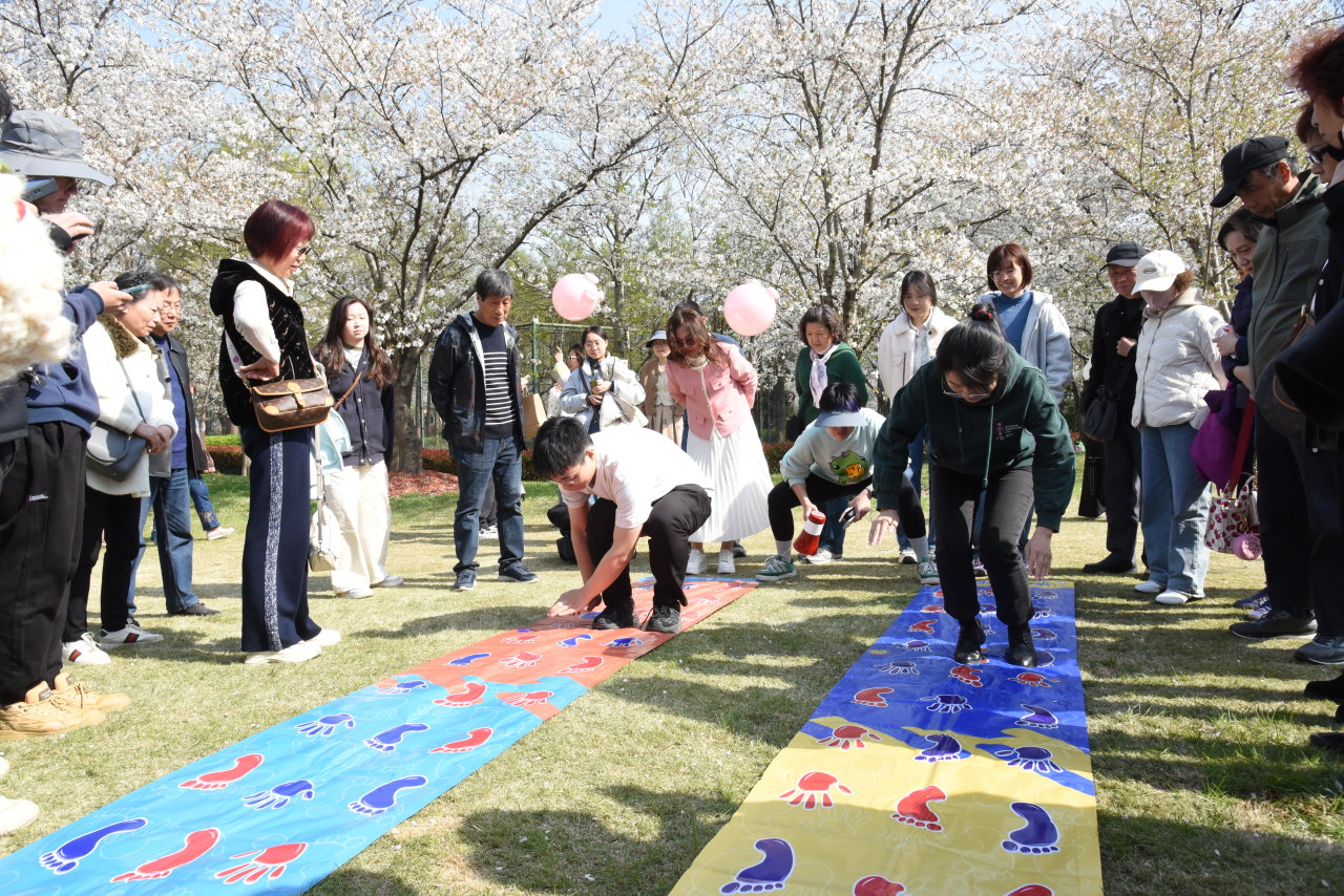 四月的顾村公园樱花如雪,教职工们结伴漫步于樱花林间,感受春日的美好气息,气氛温馨融洽。两院教职工混合组队,参与了精心设计的三个趣味游戏环节。