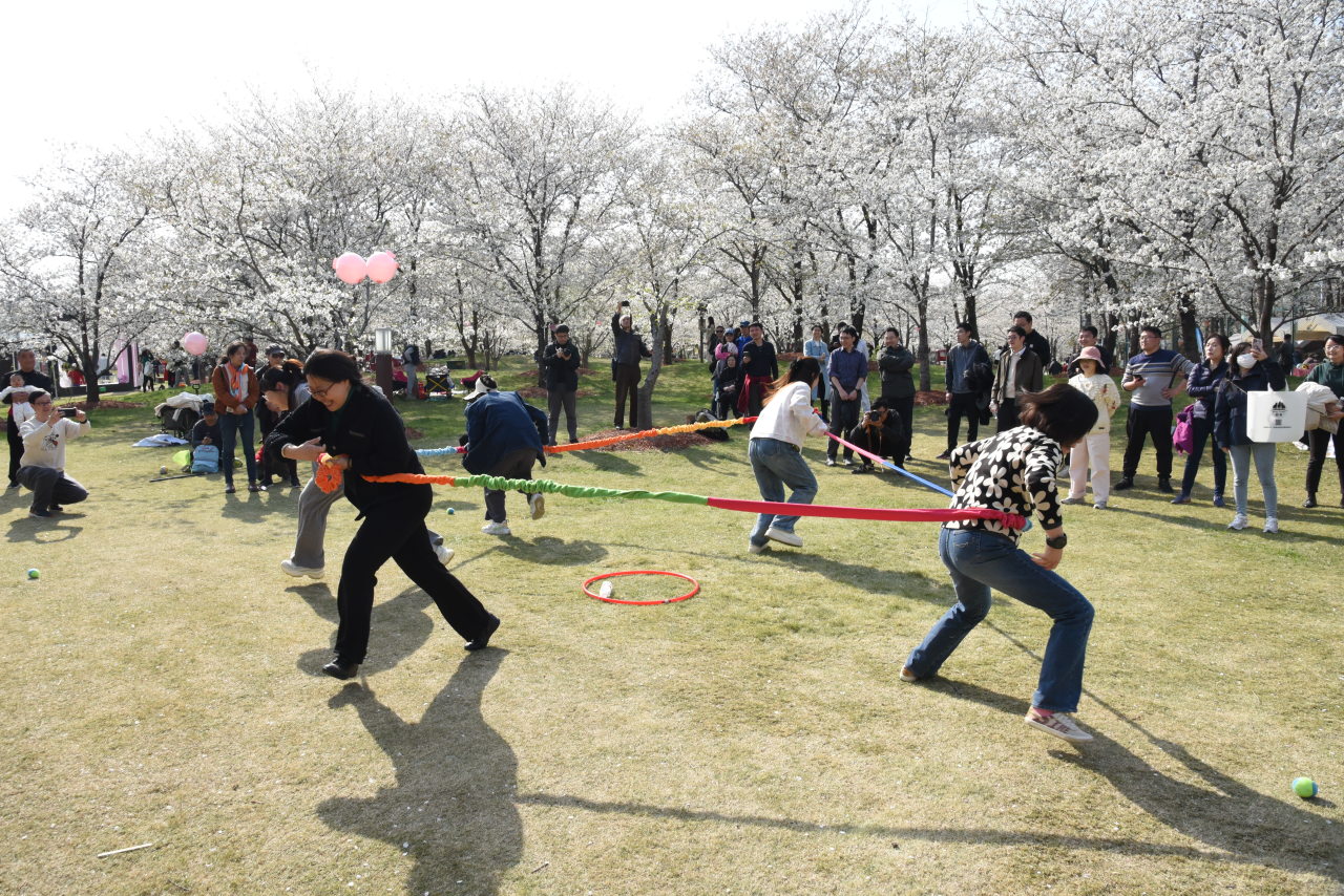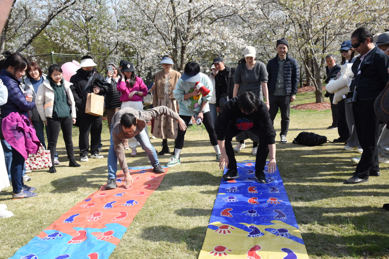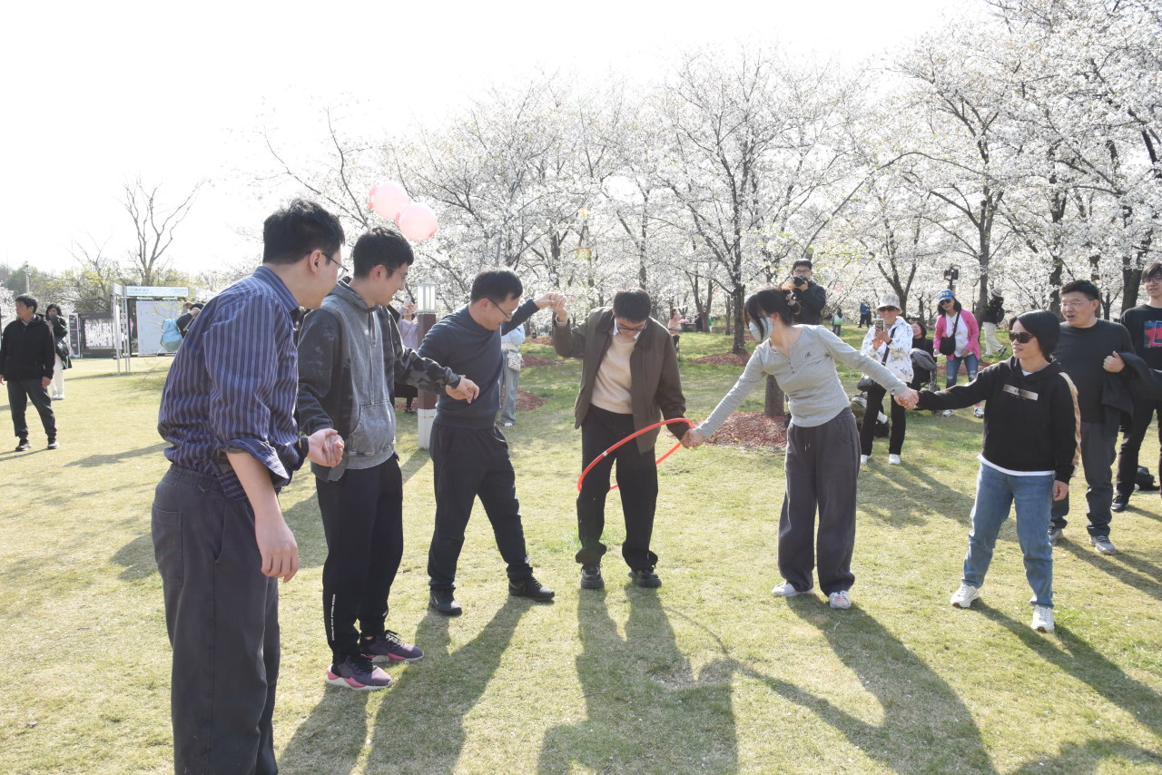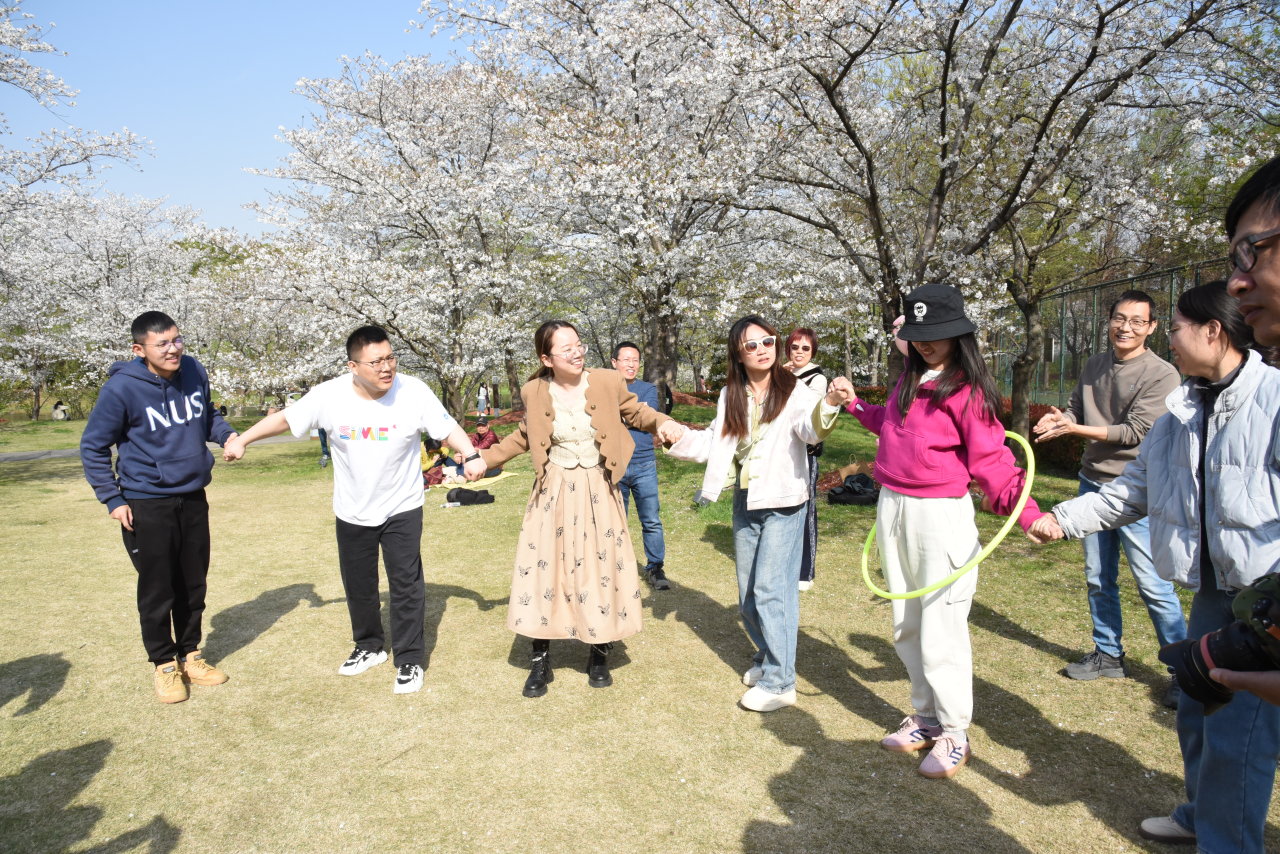 四月的顾村公园樱花如雪,教职工们结伴漫步于樱花林间,感受春日的美好气息,气氛温馨融洽。两院教职工混合组队,参与了精心设计的三个趣味游戏环节。