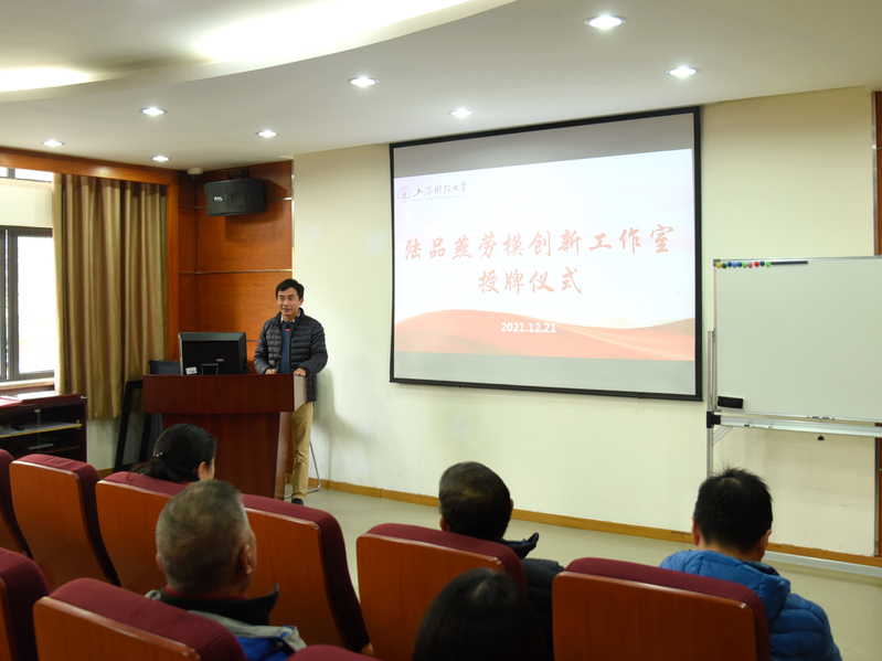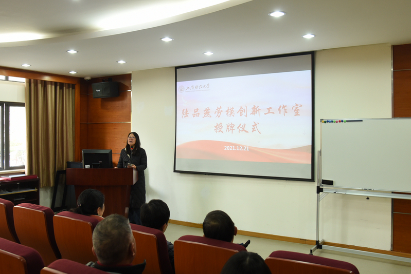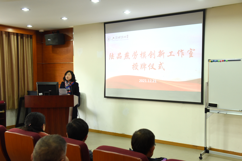 12月21日下午一点半,“陆品燕劳模创新工作室”授牌仪式在信息管理与工程学院102会议室召开。上海财经大学妇委会常务副主任、主持工会工作副主席屠天峰,原校工会常务副主席周峰,上海市劳动模范(先进工作者)、信息管理与工程学院教授陆品燕,信息管理与工程学院党委书记王淑范,常务副院长黄海量,党委副书记周燕及学院全体教职工出席了本次授牌仪式。仪式由我院党委书记王淑范主持。