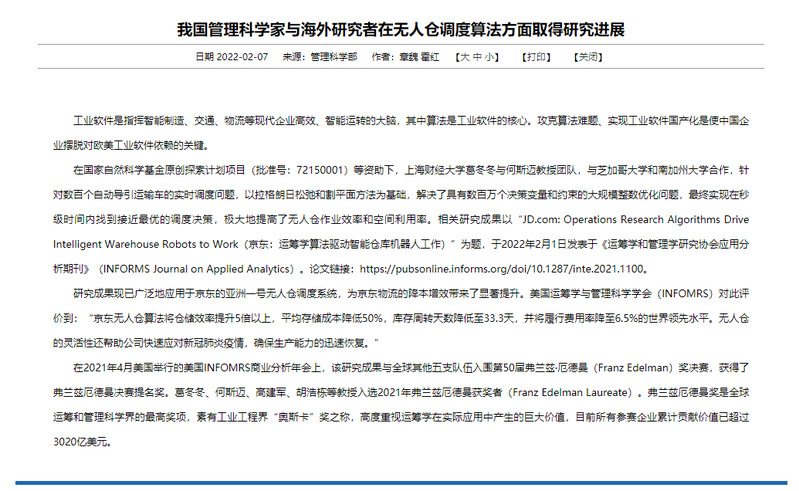 在国家自然科学基金原创探索计划项目(批准号:72150001)等资助下,上海财经大学葛冬冬与何斯迈教授团队,与芝加哥大学和南加州大学合作,针对数百个自动导引运输车的实时调度问题,以拉格朗日松弛和割平面方法为基础,解决了具有数百万个决策变量和约束的大规模整数优化问题,最终实现在秒级时间内找到接近最优的调度决策,极大地提高了无人仓作业效率和空间利用率。相关研究成果以“JD.com: Operations Research Algorithms Drive Intelligent Warehouse Robots to Work(京东:运筹学算法驱动智能仓库机器人工作)”为题,于2022年2月1日发表于《运筹学和管理学研究协会应用分析期刊》(INFORMS Journal on Applied Analytics)。论文链接:https://pubsonline.informs.org/doi/10.1287/inte.2021.1100。